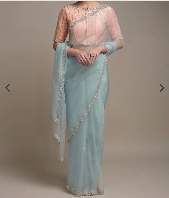 Sky Blue Saree In Organza Adorned With Embellished Floral Etsy Ireland